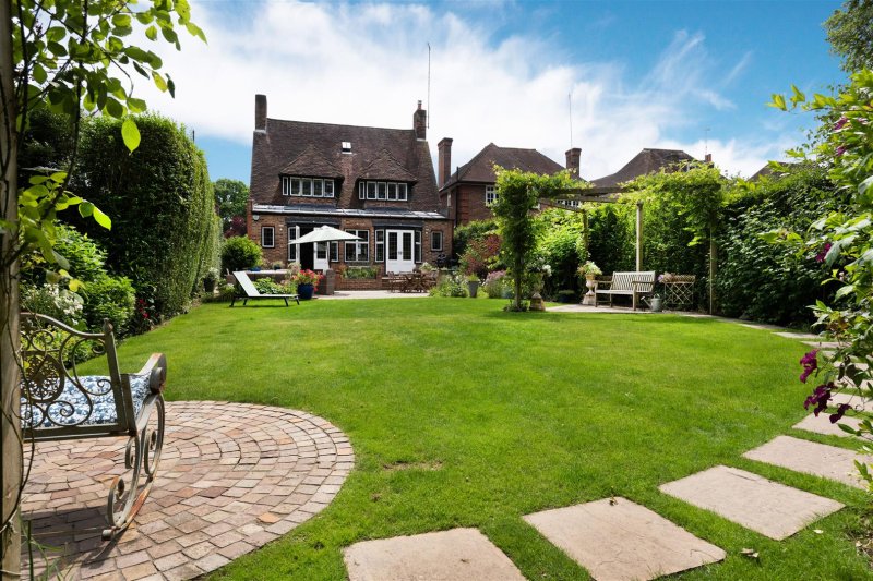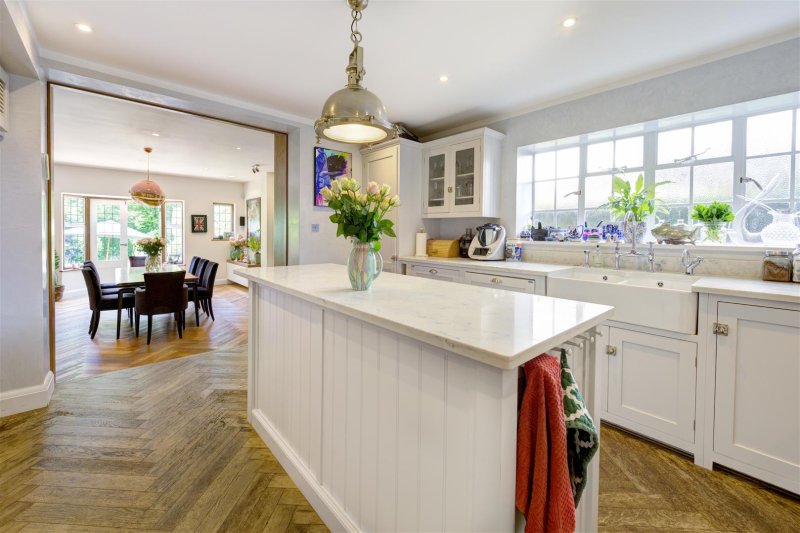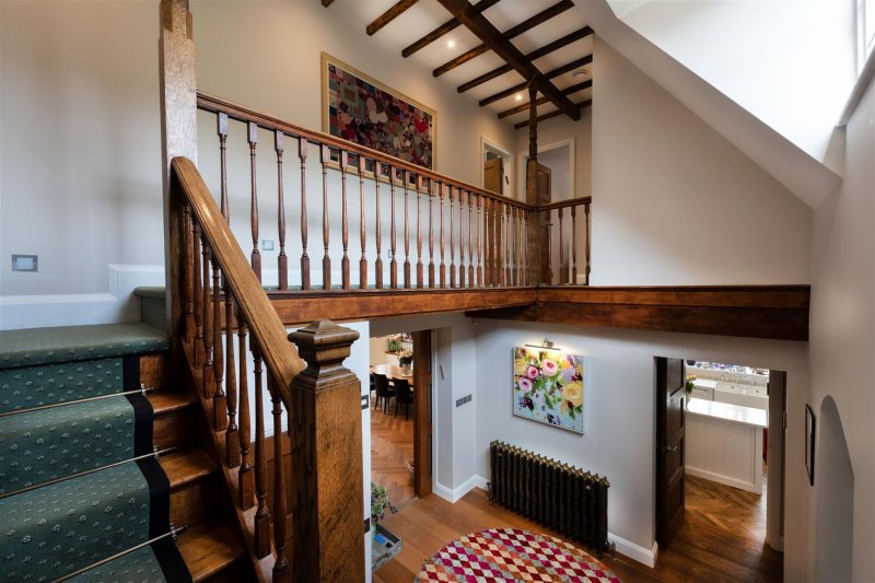 Internally there is a welcoming entrance hallway with engineered wood flooring, which shows off a beautiful galleried staircase with original carpentry, you then are led into a lateral, 23x 29 reception room spanning rear the property with herringbone wood flooring throughout and a double set of French style, patio doors opening onto a stunning, manicured west facing rear garden. Additionally on the ground floor, there is a second T.V. family reception room, a well-equipped kitchen breakfast room, guest w.c and garage.