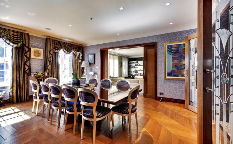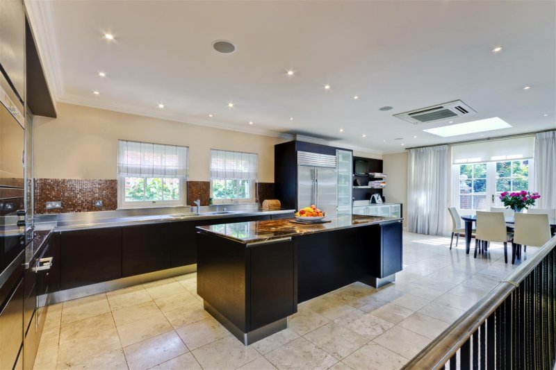 Accommodation is arranged over four floors with the centre of the house being a dramatic galleried staircase naturally illuminated by a large skylight. The ground floor features four large reception rooms and a 28' custom built kitchen/family room. On the upper floors there are seven bedroom suites including a master bedroom of 30' x 19' with his and hers dressing rooms and bathrooms.